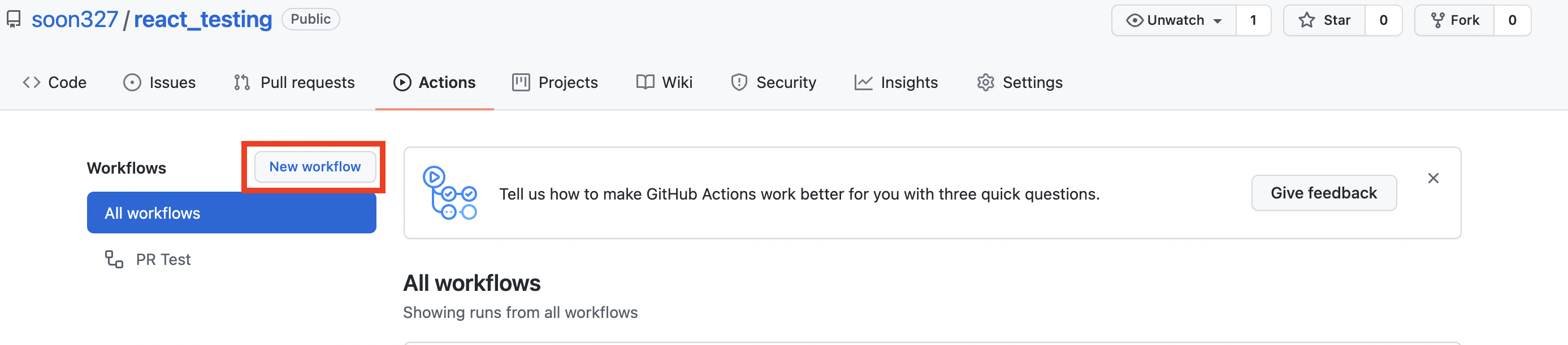 ์ด๋ ๊ฒ ์์ฑํ ์ด๋ฆ์ repository์ Actionsํญ์์ ์๋์ฒ๋ผ ํ์ธํ ์ ์๋ค. (name: PR Test)