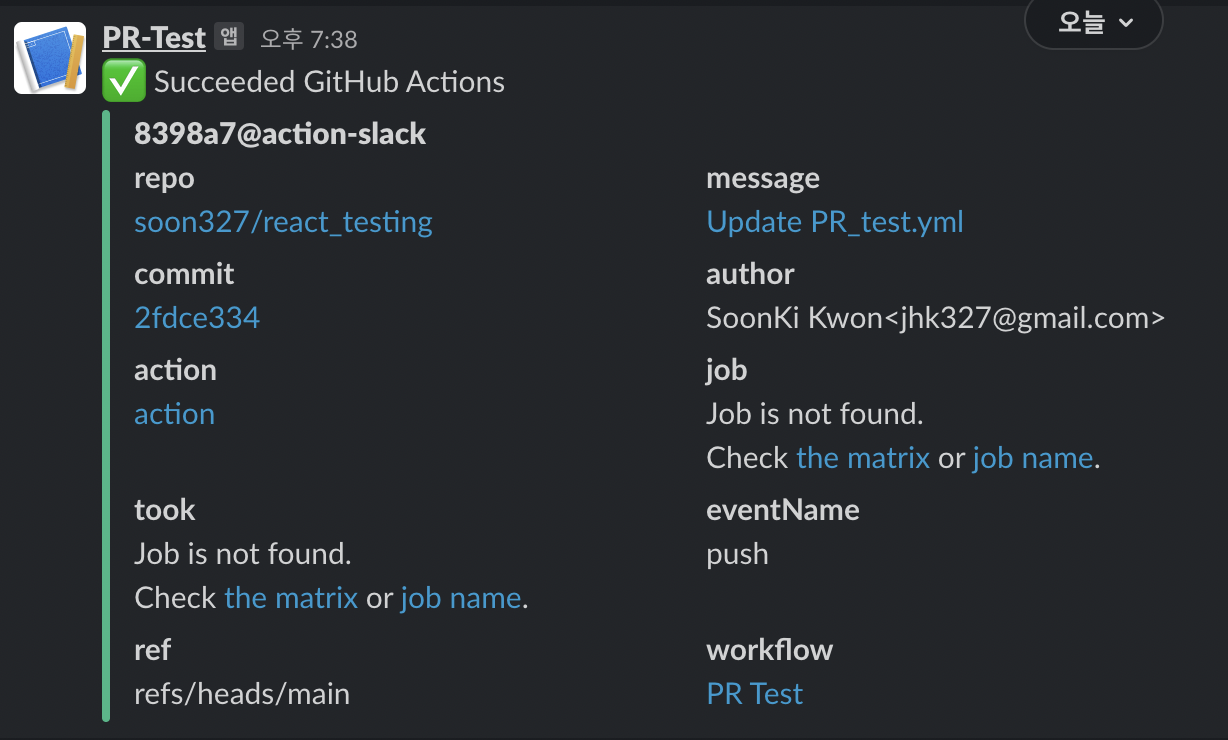 이후 git action이 실행되면 아래처럼 슬랙에 알람이 가게된다.