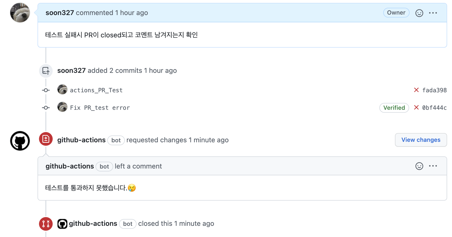 - PR 시, 테스트 실패할 경우 자동 closed 및 comment 작성